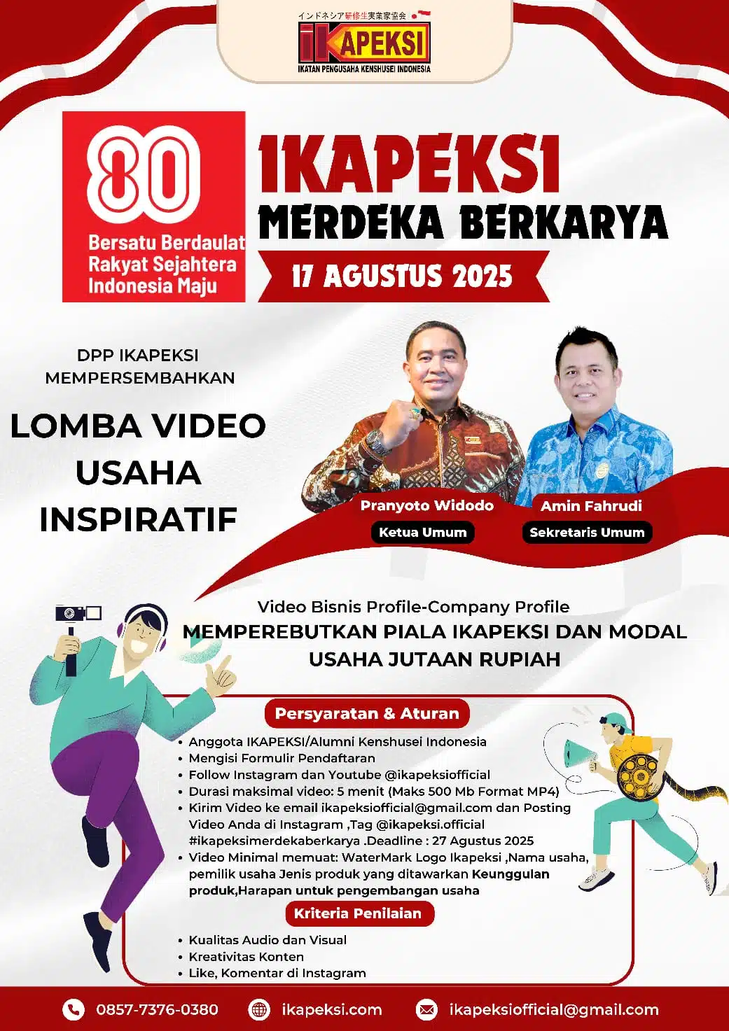 Pernah kepikiran kalau usaha kamu bisa jadi inspirasi buat banyak orang? Nah, sekarang saatnya tunjukkin! Dalam rangka memperingati Hari Kemerdekaan RI ke-80, IKAPEKSI (Ikatan Pengusaha Kenshusei Indonesia) menggelar Lomba Video Usaha Inspiratif bertema IKAPEKSI Merdeka Berkarya. Acara ini akan berlangsung 17 Agustus 2025 dan terbuka untuk semua anggota IKAPEKSI serta alumni Kenshusei Indonesia.